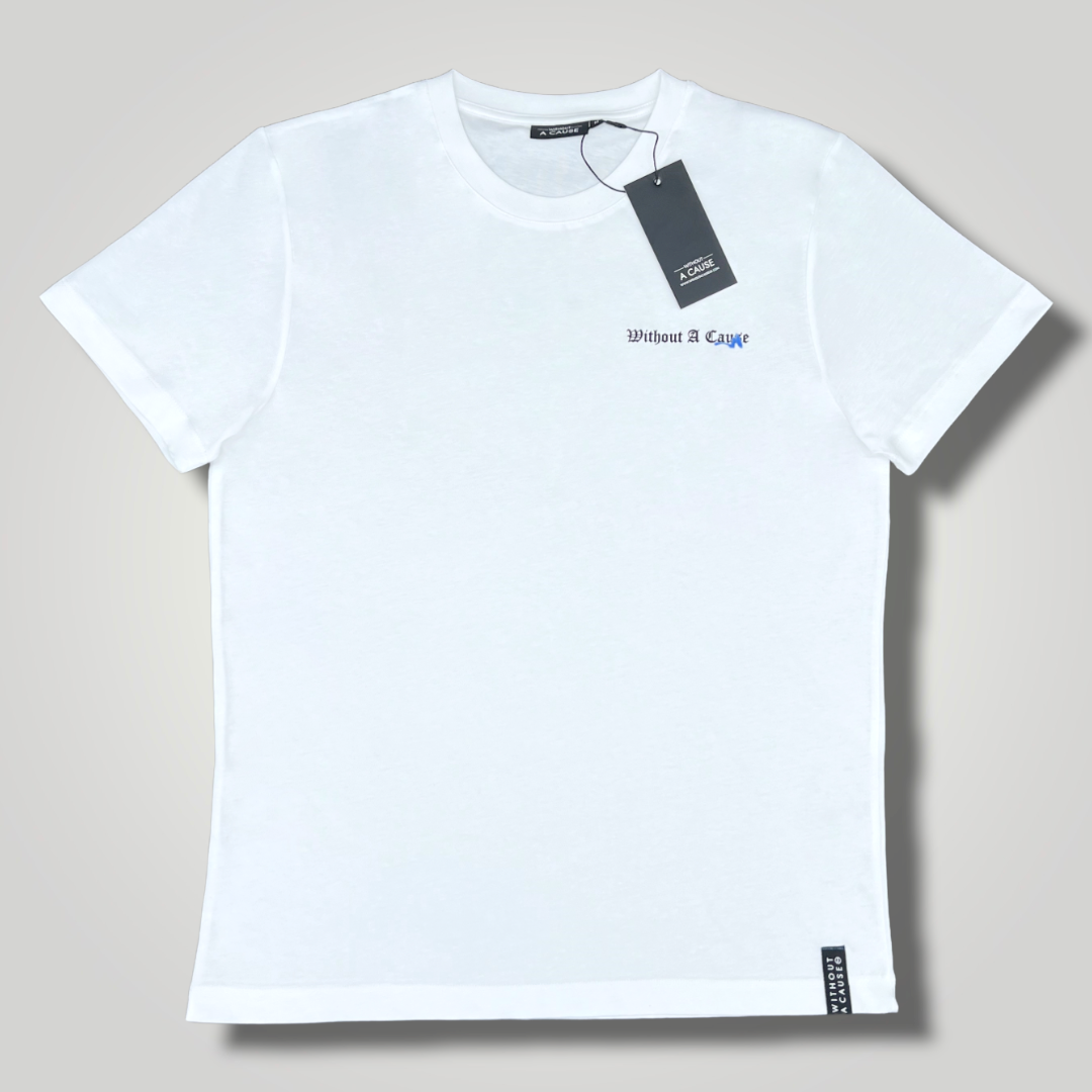 Our exclusive blue spray tee shirt from the Next Level Collection is available in White . With a small placement print to the front with blue highlighted spray effect. Crafted from 100% Cotton in our original slim block. Without A Cause branding and swing tags.