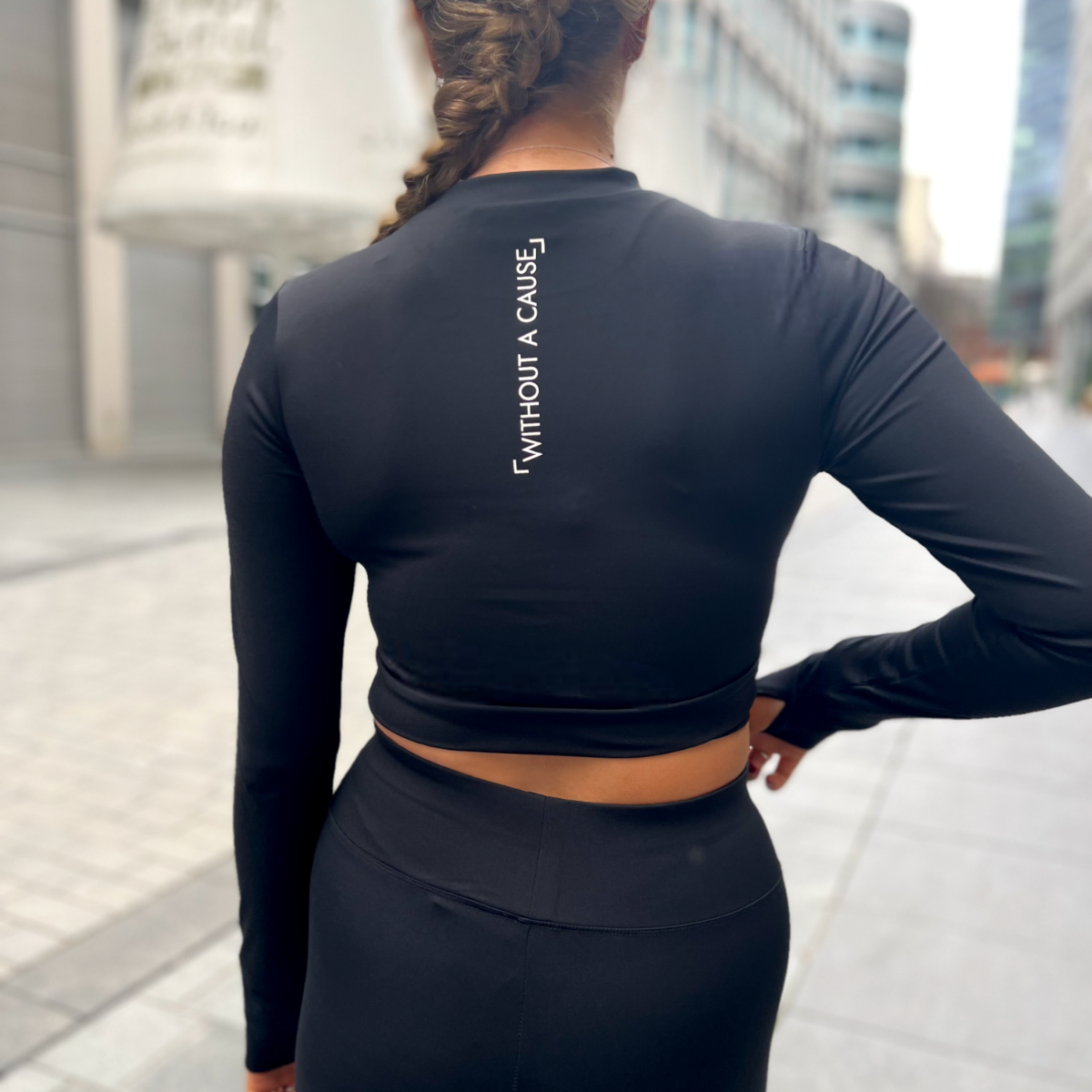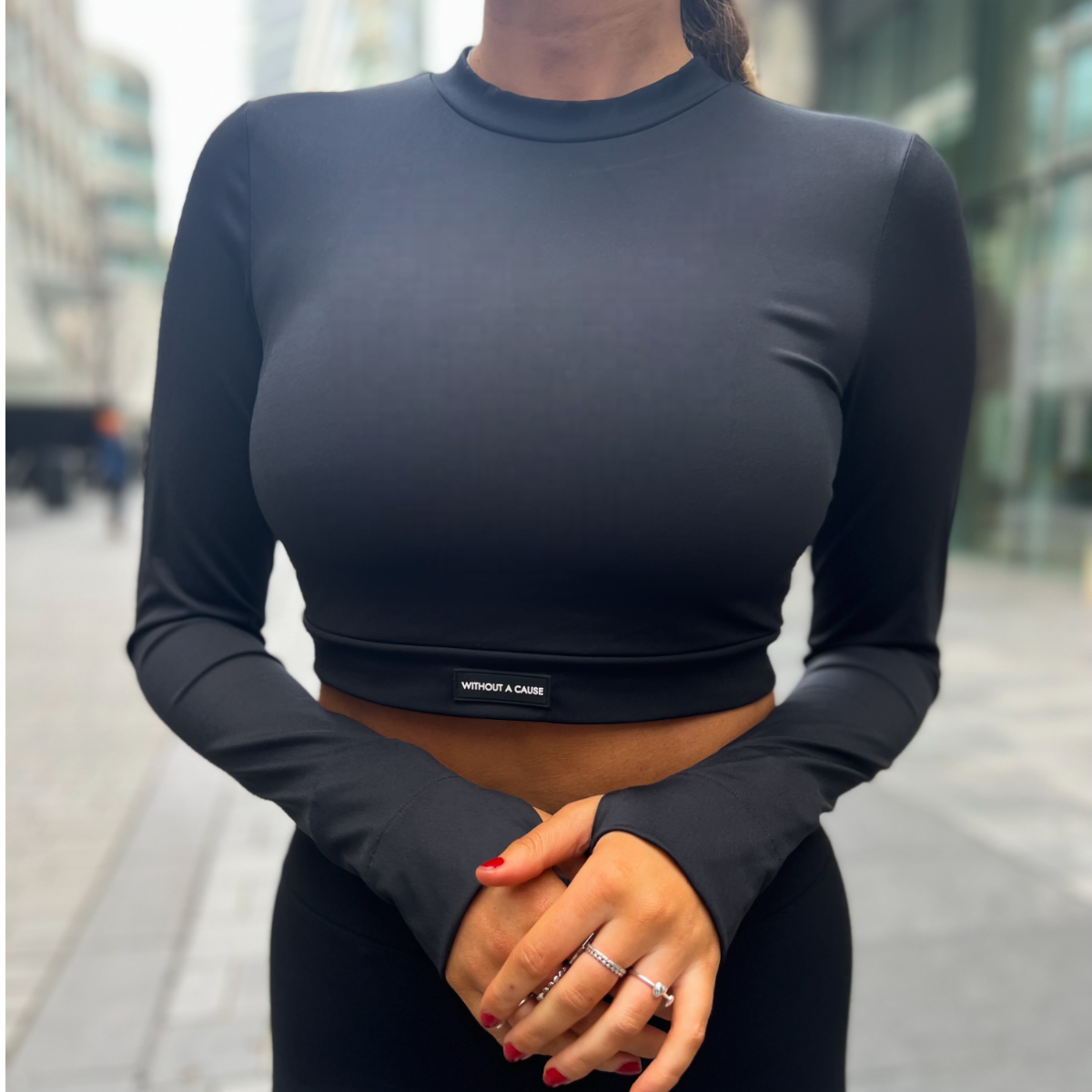 Wear it in the gym with this women's Long Sleeve Cropped Gym Top. In a Black colourway, this slim fit top is cut from a smooth, body form which allows you to focus on your goals. It features a rounded neckline, long sleeves with thumb hole for coverage and is finished with a silicone raised Without A Cause Badge and Back Print.